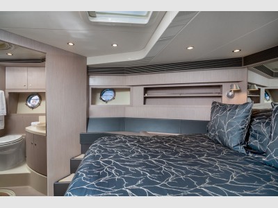 La barca a motore RIVA 63 dispone di 1 cabina master doppia, 1 cabina Vip doppia e 1 cabina con letti separati disponibile su richiesta.