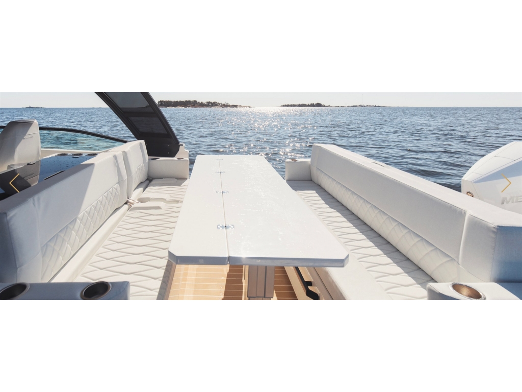 Il Saxdor 320 GTO è il perfetto equilibrio tra design italiano, funzionalità americana, qualità tedesca e un prezzo in stile francese. Dotato di T-top e camminamenti laterali walk-around, offre un design raffinato, prestazioni potenti con motori fuoribordo e una carena efficiente ed economica in navigazione. Tutte e tre le versioni (GTO, GTC e GT) condividono queste caratteristiche distintive. La configurazione con un singolo motore Mercury V8 da 300hp permette di raggiungere una velocità massima di 40 nodi, con una crociera comoda intorno ai 30 nodi. Con due motori da 300hp, invece, il Saxdor 320 supera agilmente i 50 nodi, mantenendo un?andatura ottimale tra i 20 e i 40 nodi. Il prendisole esteso a prua e la dinette convertibile in zona relax offrono ampi spazi per sdraiarsi e godere il sole. Inoltre, con un semplice gesto, lo schienale ribaltabile trasforma le sedute frontali in comode panche rivolte verso prua per accogliere gli ospiti. Contattaci per maggiori dettagli.