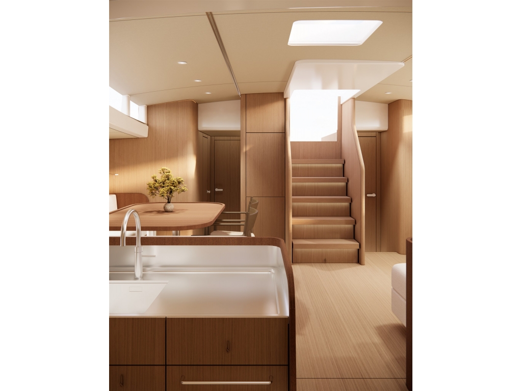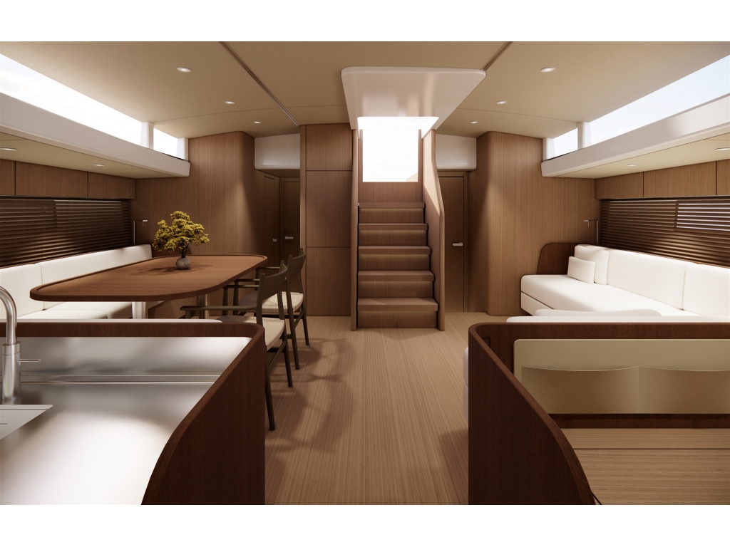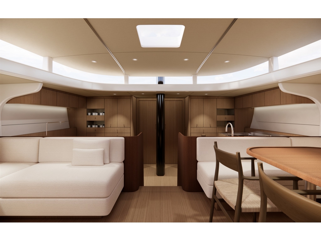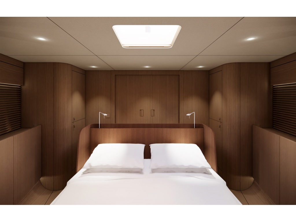 Gli interni, sviluppati insieme al designer David Thulstrup, sono disponibili in diversi layout da 2 a 4 cabine e combinano materiali naturali e finiture luminose per creare un ambiente caldo, silenzioso e confortevole. Il pozzetto di grandi dimensioni con tavolo centrale e la piattaforma bagno elettrica aumentano la fruibilità degli spazi esterni in rada e all?ormeggio.