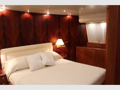 Armatoriale a centro barca con cabina armadio e bagno con doccia; Cabina Vip con entrata dalla dinette con bagno; Due cabine ospiti con letti in piano, ognuna con bagno; Cabine comandante e marinaio a prua con bagno in comune. Interni in ciliegio. Salone a L con divani contrapposti, mobile tv, tavolo per 10pax; Plancia di comando a tutto baglio. Cucina completa di lavastoviglie e lavatrice, frigo, freezer e forno.