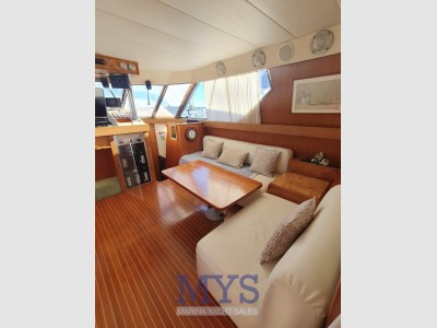 Grande salone con pavimentazione in teak seduta a L a destra e tavolo - zona timoneria sul lato sinistro arredi in radica noce