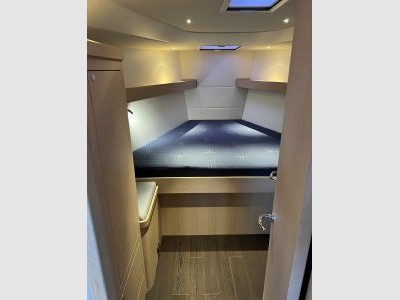Cabina armatoriale a prua con letto matrimoniale a V e bagno con doccia; due cabine ospiti matrimoniali a poppa; bagno ospiti con doccia; Bagni con wc elettrici Jabsco.