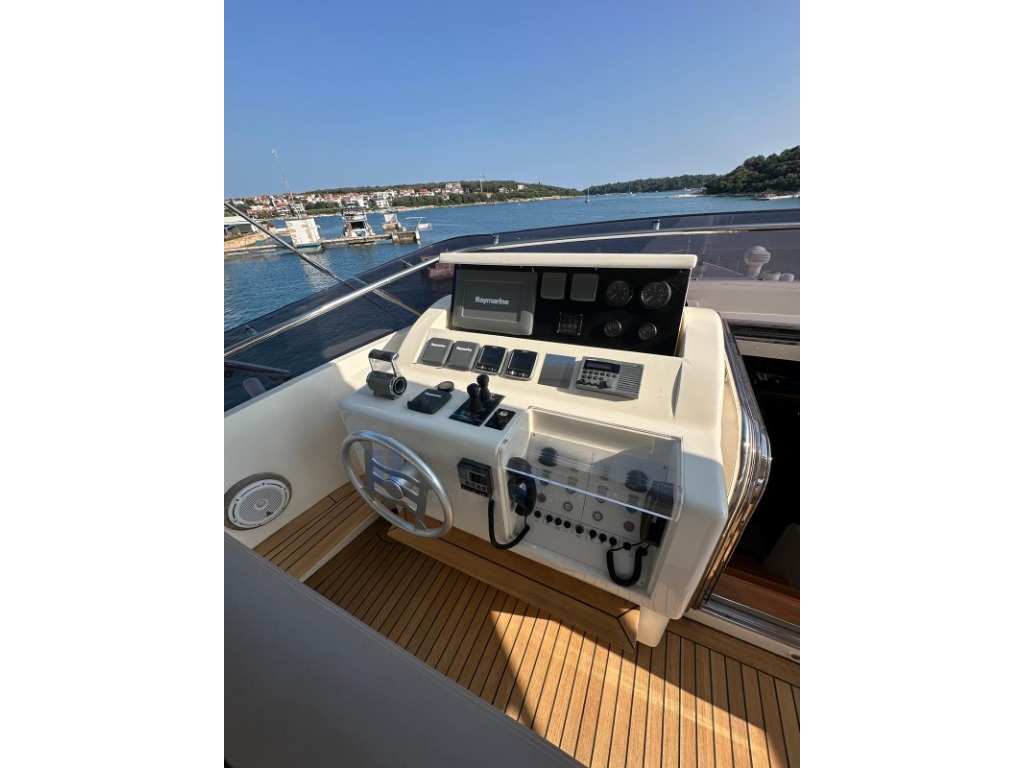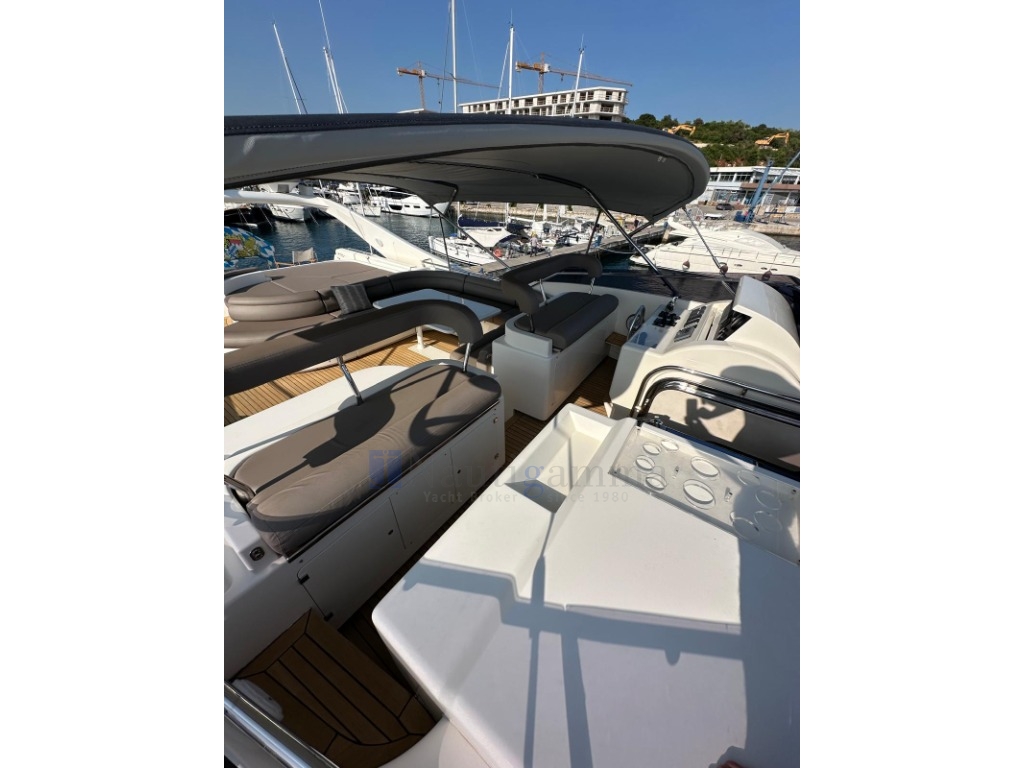 Cuscineria di coperta completa di prendisole, Bimini fly (2025), Fly completamente attrezzato, Vasca idromassaggio sul fly, Grande tavolo pozzetto, Doccia in pozzetto, Scaletta bagno, Piattaforma da bagno, Passerella idraulica, Garage idraulico di poppa, Luci di poppa subacquee. IPER ACCESSORIATA!
