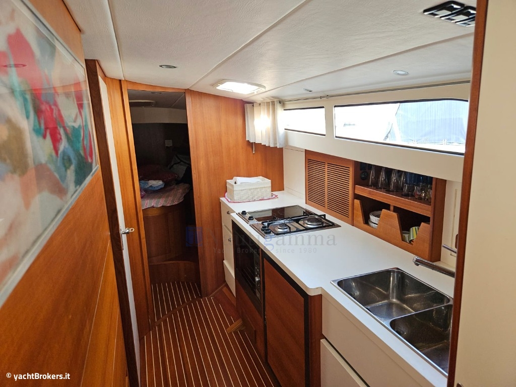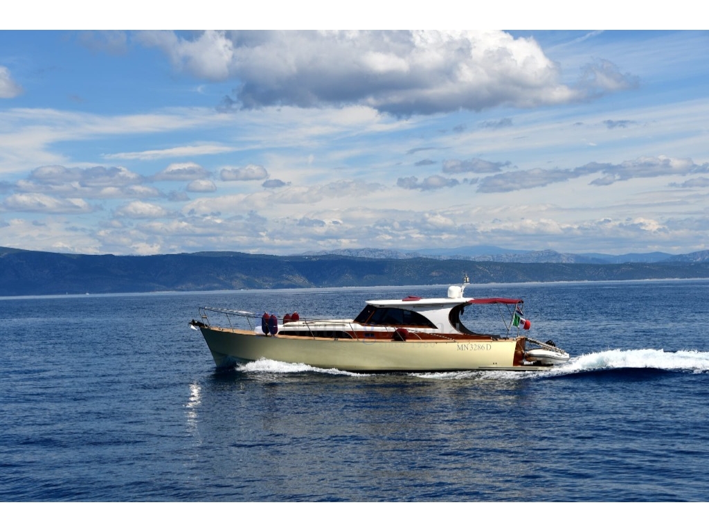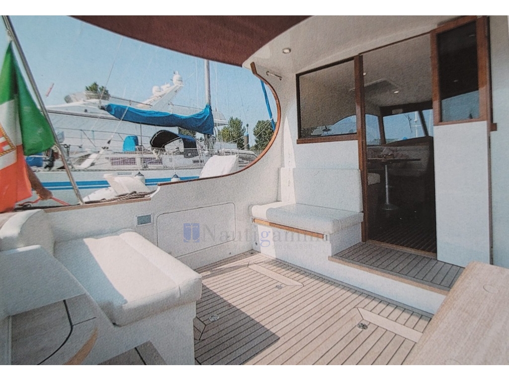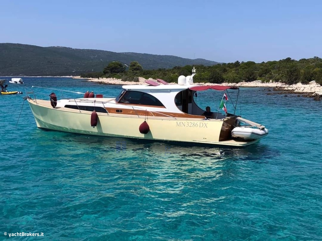 Ampio prendisole a prua, Due divani a poppa, Frigo/congelatore pozzetto, Doccia esterna, Spiaggetta 1,1x3mt, Passerella idraulica, Tender Zodiac + f.b. Honda 2.3, Gavoni ricovero motore tender.