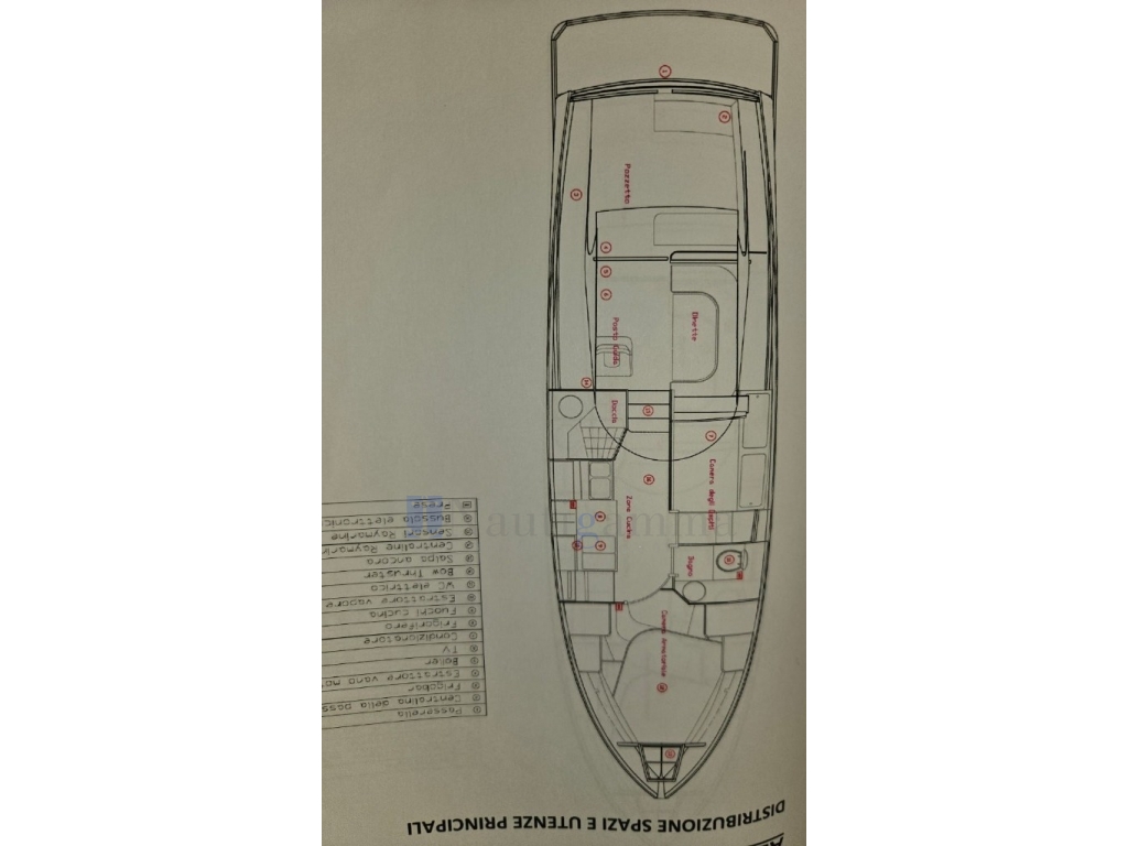Cabina armatoriale a prua; Cabina ospiti matrimoniale a sinistra.