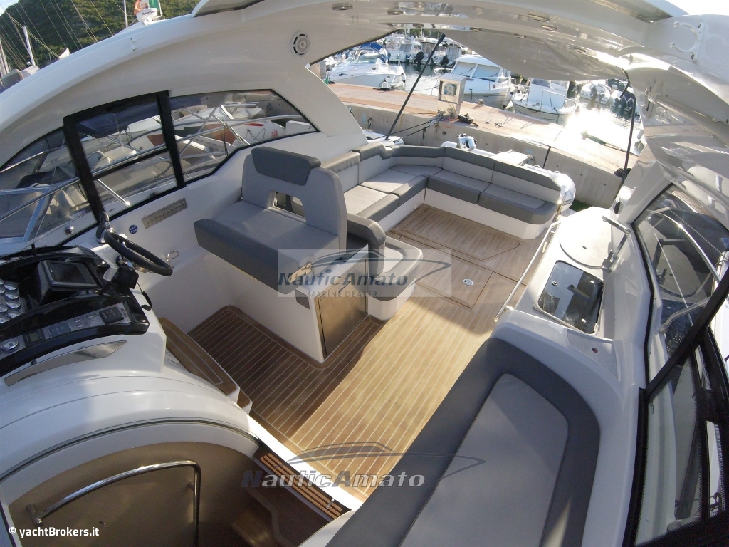 Tante le soluzioni intelligenti adottate, tra cui uno dei più grandi pozzetti esterni della categoria, pensato con un generoso divano a ?C? da 8 posti integrabile con un tavolo a comando elettro-pneumatico che alla necessità e grazie ad un prolunga ed un cuscino (non presente), diventa un grande prendisole di poppa che va ad aggiungersi a quello già molto generoso di prua, pensato anche con gli schienali reclinabili!