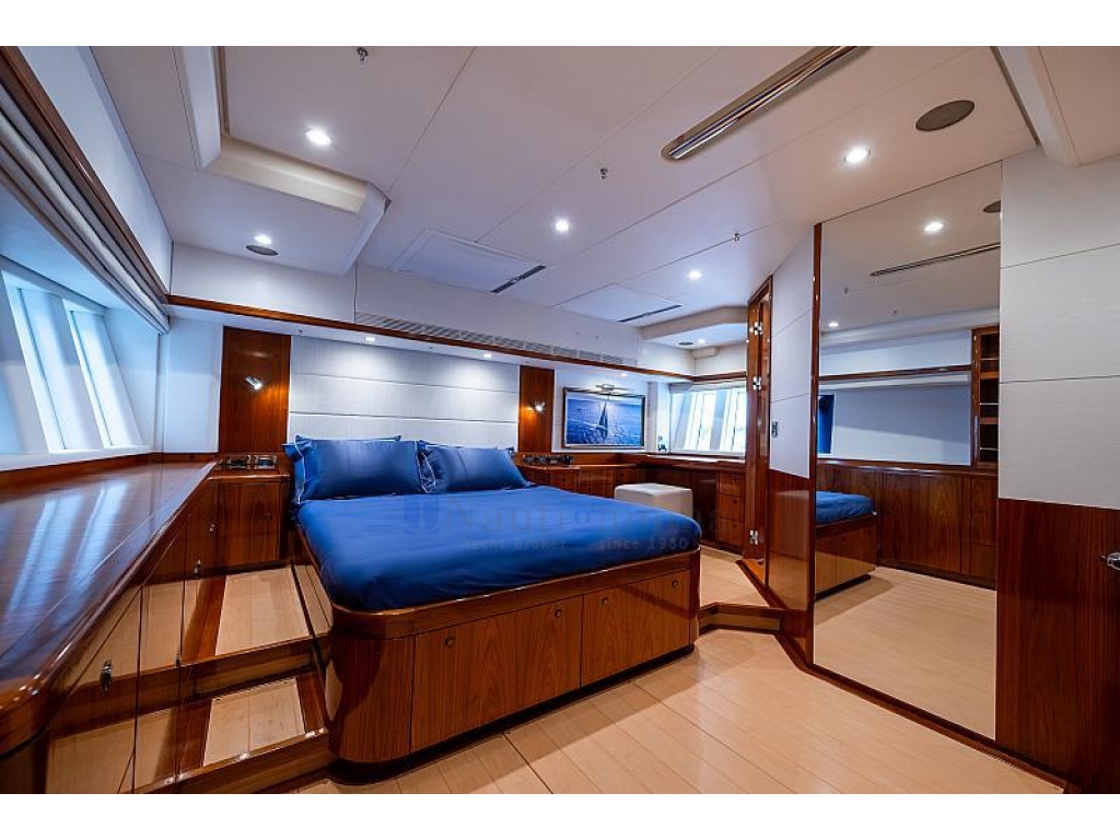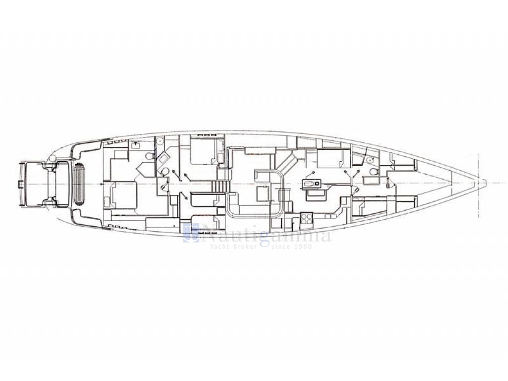 Quattro cabine doppie: armatoriale a poppa con bagno ensuite con doccia; Cabina ospiti matrimoniale e cabina ospiti con letti i piano (bagno e doccia in comune); Cabina ospiti con letto alla francese.