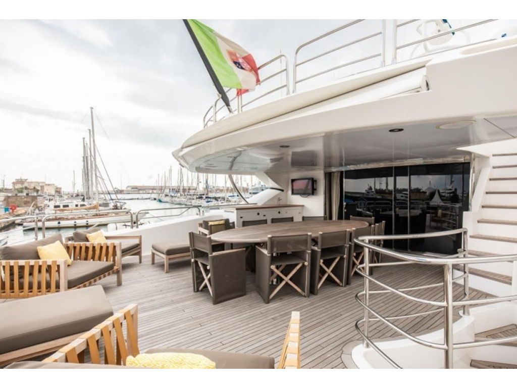 Equipaggiata con 2 motori MTU da 3.180 Hp e dotata di stabilizzatore, garantisce comfort sia in navigazione sia all'ancora.