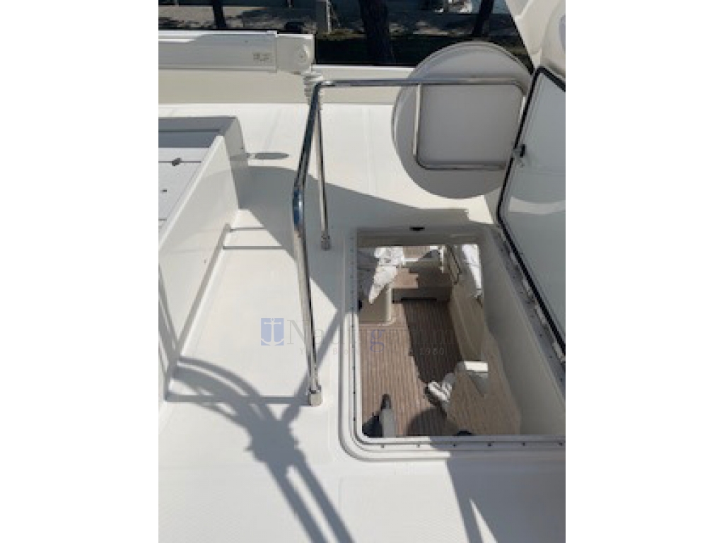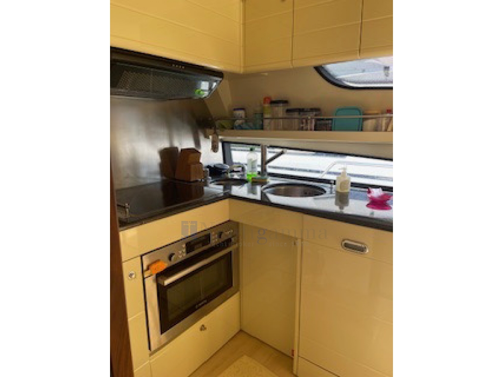 Tavolo pozzetto in teak allungabile fino a 8 posti (divanetto + 4 sedie), Panca di poppa ribaltabile elettricamente, Lavello a poppa con acqua dolce e salata, 2xDocce pozzetto, Doccia di poppa, Lavello fly, Frigo fly (2025), Gavone di poppa con apertura elettrica, Coperture estive e invernali cuscinerie e posto guida fly, Tendalino parasole a poppa, Norvegese, Tendalino fly con 4 aste acciaio (da baia), Passerella Besenzoni, Scaletta bagno con maniglione acciaio, 2xAncore (Bruce 50kg e Delta) e catene maggiorate (2x100x14), Contacatena ancora dx, Gruetta 600kg, Fari subacquei a poppa. Nr 2 Zattere per 6 persone.