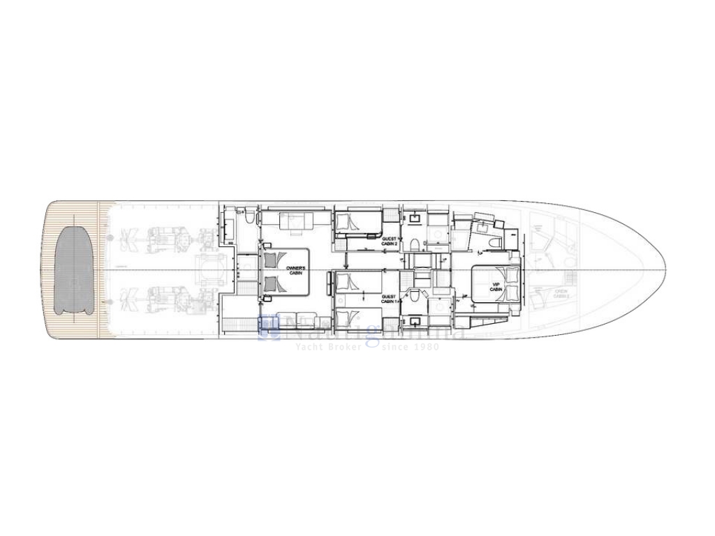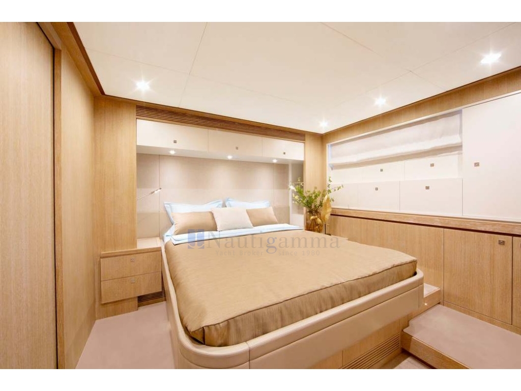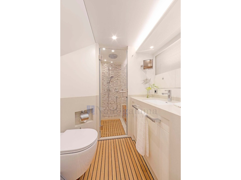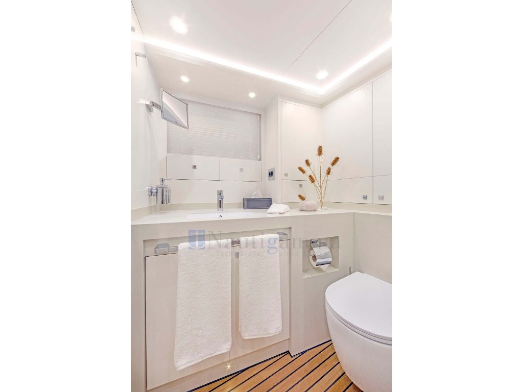 1 armatoriale matrimoniale king size a tutto baglio centro nave con scrivania, area salotto e cabina armadio; 1 VIP matrimoniale a prua; 1 ospite doppia (letti scorrevoli); 1 ospite a castello; bagno privato in ogni cabina (cabine doccia e pareti bagni in corian e ceramica, wc/bidet elettrici Planus).