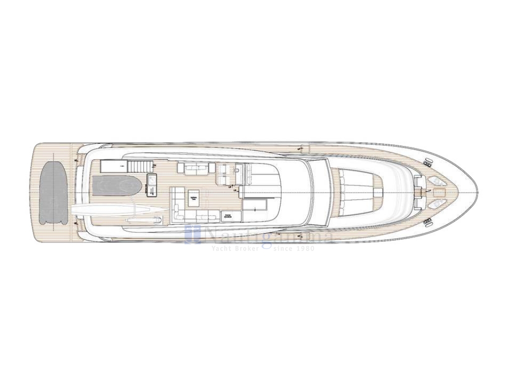 Tendalini e soft top, 2 Ombrelloni, Gradini scale con luci led integrate, Tavolo pozzetto per 8p., Sedute a prua su più livelli e area prendisole, Fly attrezzato (con mobili modulari, area bar e diverse sedute), 3x Riscaldatori a infrarossi in pozzetto, Sistema lavaggio ponte, Doccia calda/fredda e scaletta bagno retrattile integrata nella Piattaforma nuoto idraulica abbassabile Opacmare, Passerella idraulica Opacmare, Gruetta fly, Tender Williams Sportjet 395 attrezzato, Luci subacquee Sea Vision led.