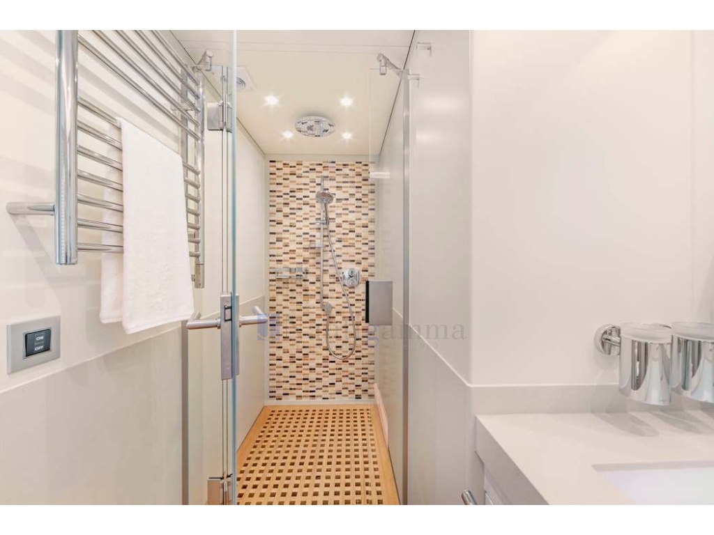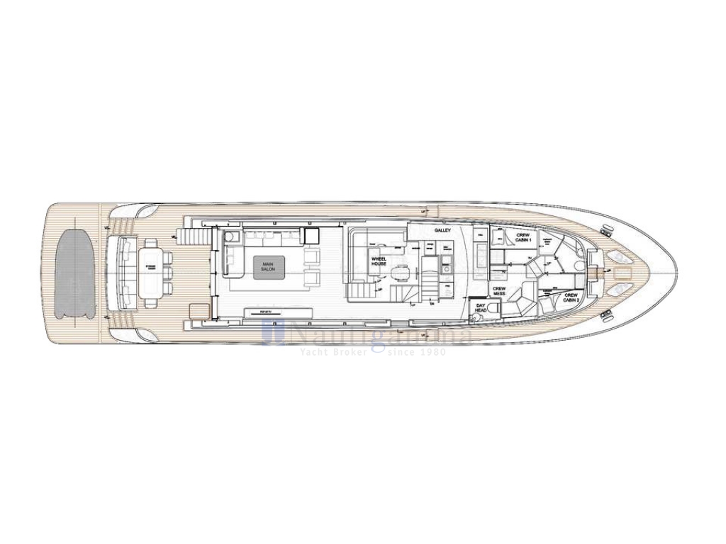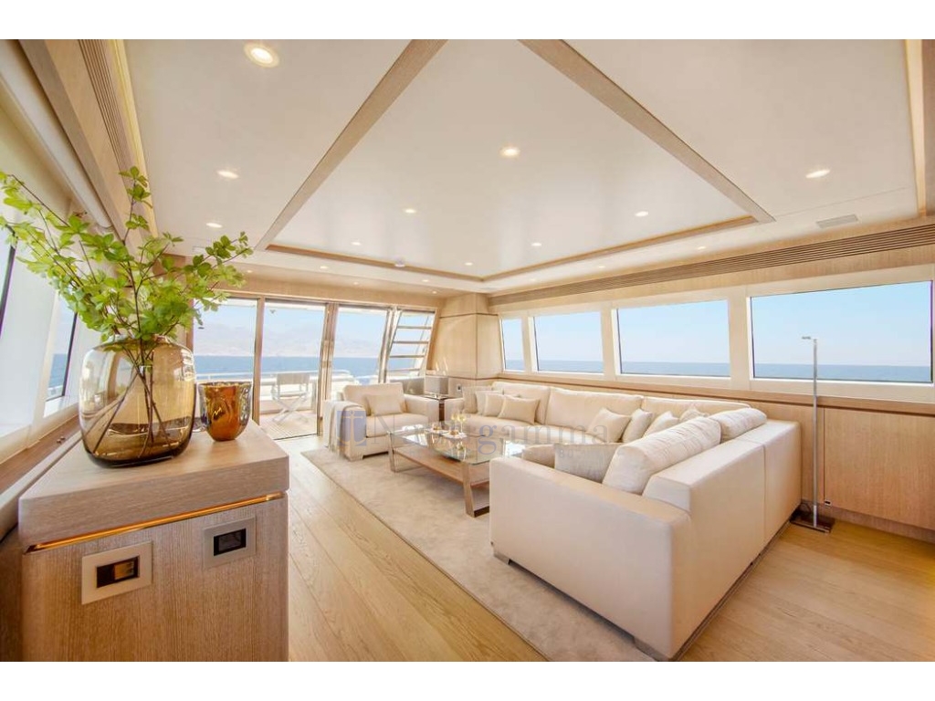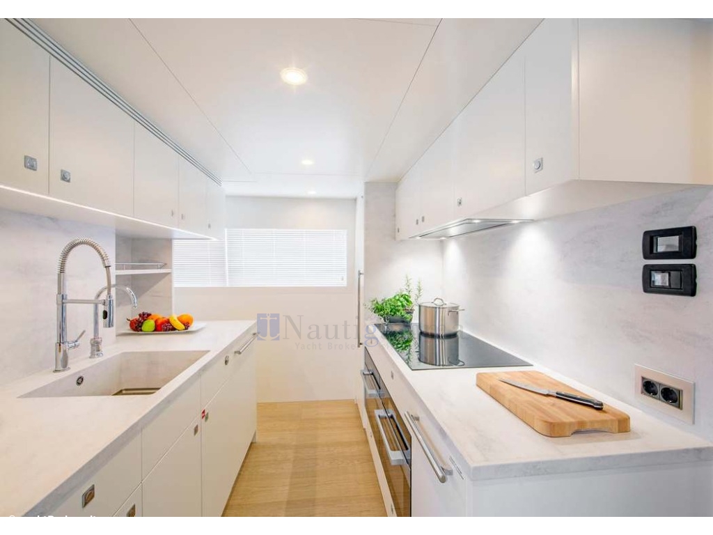 Layout con un ampio salone principale con divani e poltrone e un'ampia zona salotto nella timoneria, con cucina a prua con piani in corian (anche nei bagni). Day toilet.