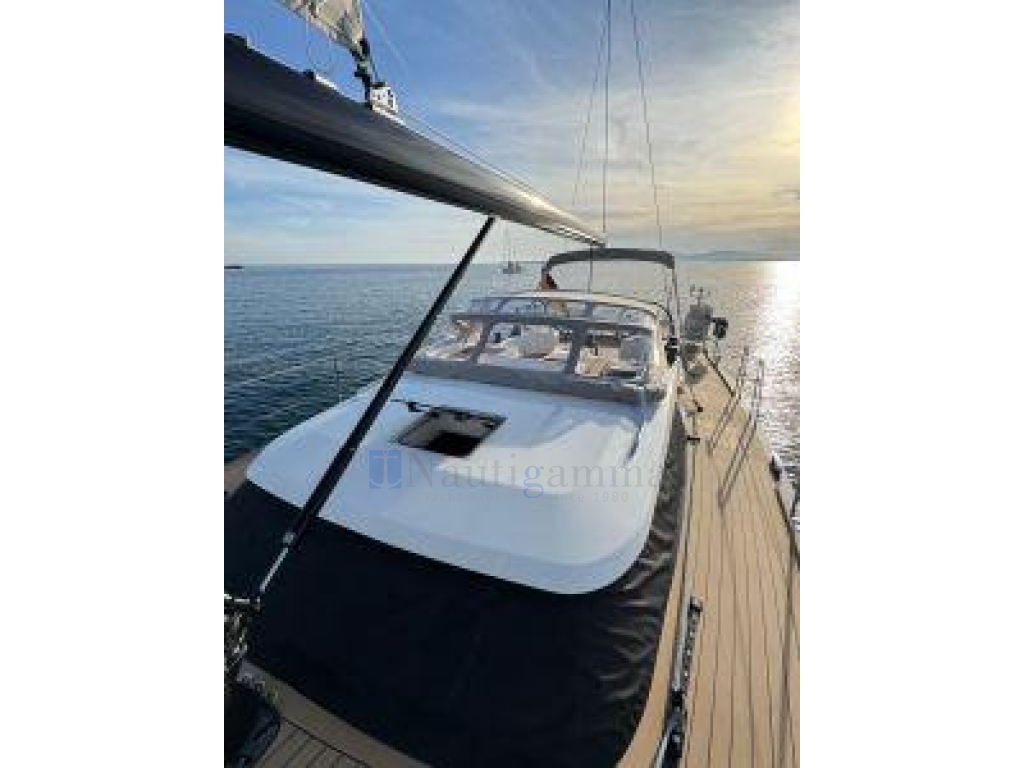 Sprayhood in Sumbrella con finestra centrale avvolgibile, Due bimini con parte di collegamento per il passaggio scotta della randa, Cuscineria pozzetto, Tavolo pozzetto con frigo, Pompa lavaggio ponte (acqua dolce e di mare), Ancora inox 45KG Ultra con 90m catena, Salpancora elettrico, Specchio di poppa apribile, Scaletta bagno in inox, Passerella in carbonio, Tender Pischel+fuoribordo elettrico Mitek 6hp, Garage per tender, Zattera Transocean Plastimo per 8 persone.