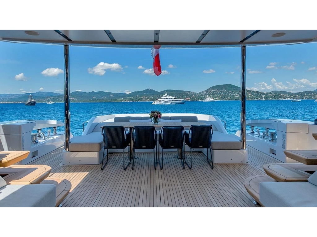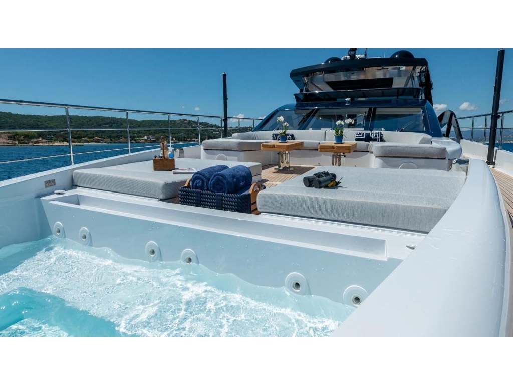 Sul fly si estende uno spazio tutto dedicato agli ospiti sino al sundeck di prua con una jacuzzi vista mare.