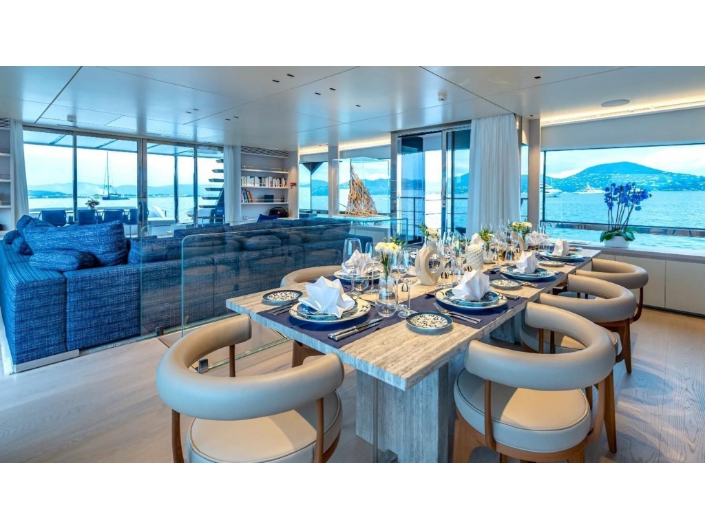 L'imbarcazione si presenta in condizioni pari al nuovo. In perfetto stile Amer Yachts semi-costum offre spazi interni ed esterni eleganti e di design, a firma dell'architetto Stefano Tini. Con i suoi 35 metri, offre 5 spaziose cabine per 10 ospiti: una cabina armatoriale sul ponte principale e scendendo sottocoperta, in centro barca si trovano due cabine matrimoniali e due doppie con letti in piano convertibili; tutte con bagno ensuite. A prua, l'area equipaggio è dotata di 4 cabine per 6 persone.