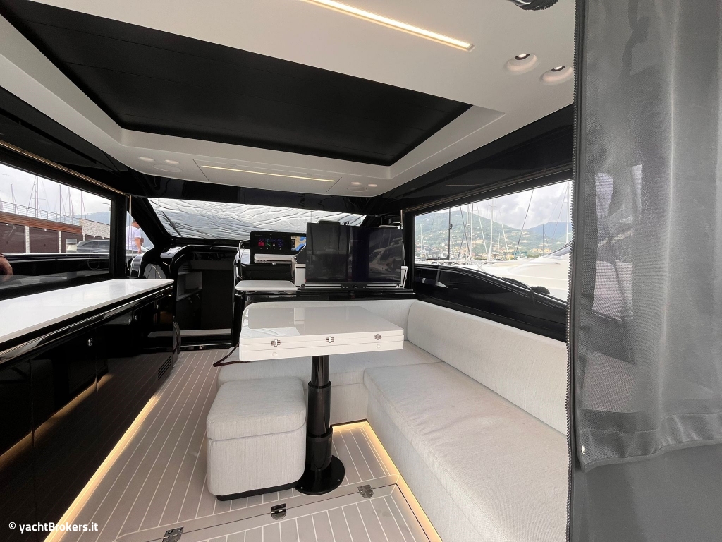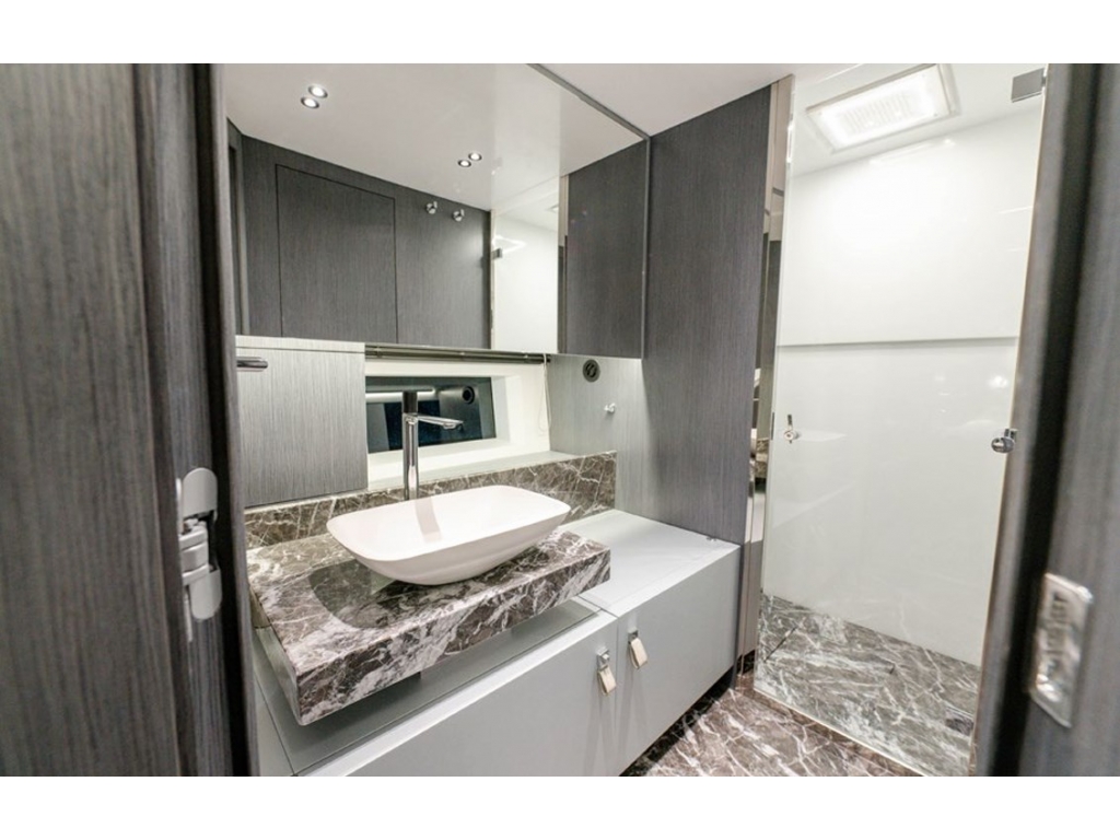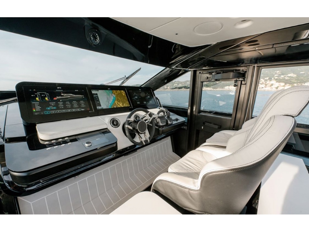 L'imbarcazione è equipaggiata con 2 motori Volvo Penta da 725Hp e ben accessoriata con: apertura lamellare dell'hard-top, tenda elettrica poppiera, stabilizzatore Quick Gyro, finestre laterali elettriche, elica di prua, passerella e piattaforma personalizzate, pozzetto in teak, garage per tender, porta scorrevole a due ante per la chiusura del salone e molto altro.