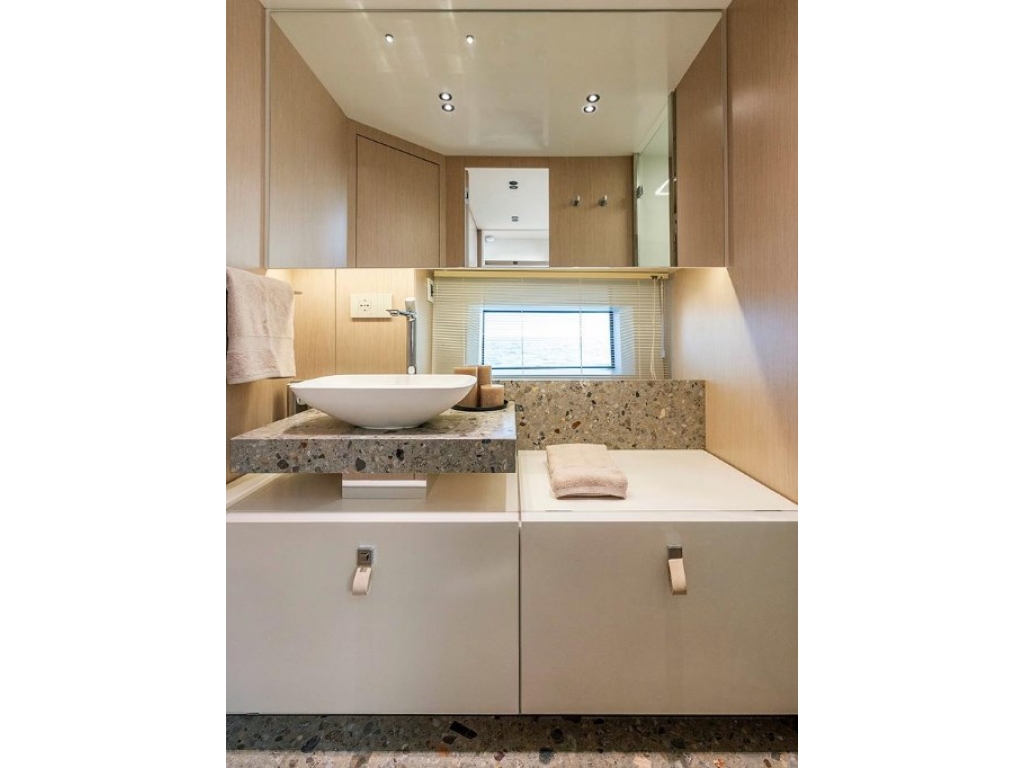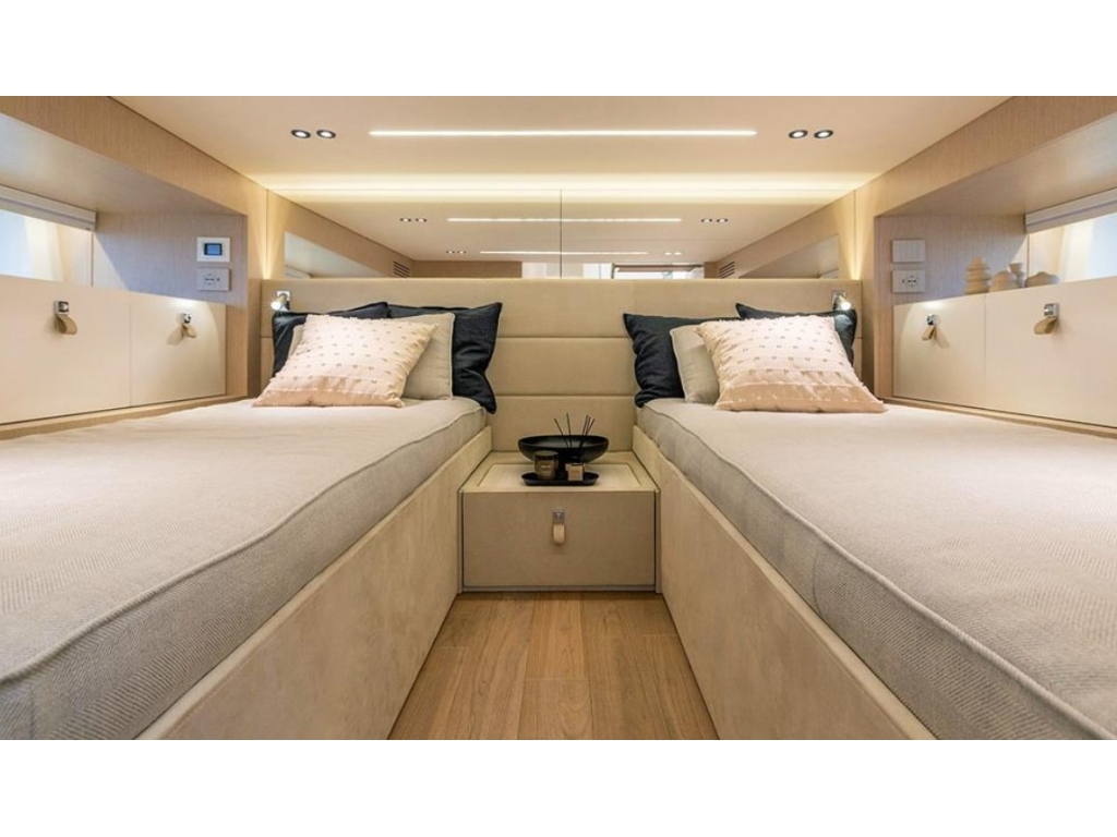 Si distingue per le sue linee moderne, con rifiniture di pregio e un curato decor interno. La disposizione degli spazi a bordo offre: ampi prendisoli e una zona living a poppa. All'interno dispone di un?area dinette e sottocoperta di due cabine per 4 ospiti: un'armatoriale con letto matrimoniale e una doppia con letti in piano + 1 bagno.
