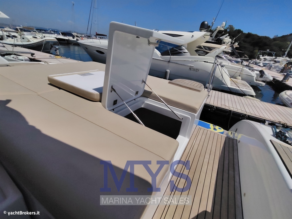 Verniciatura totale scafo e coperta in gelcoat, teak completo anche sui camminamenti laterali, nuova plancia di comando, tappezzerie nuove, interni wrappati e mobile cucina pozzetto su misura con celle frigorifere in acciaio.