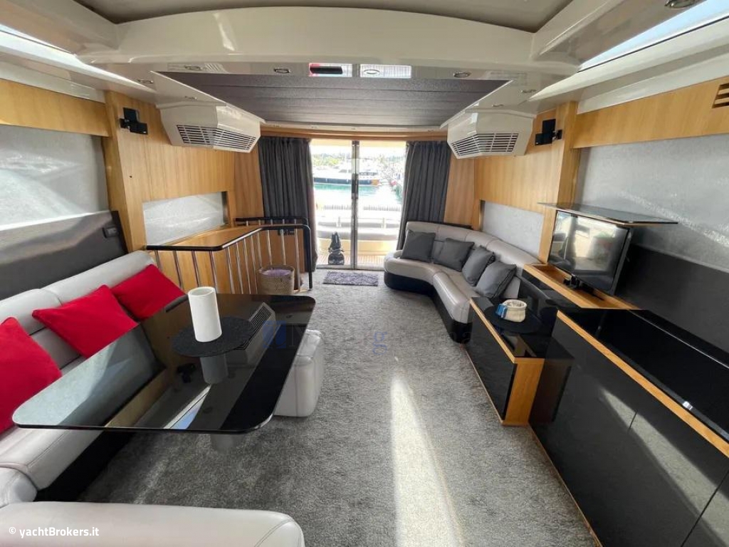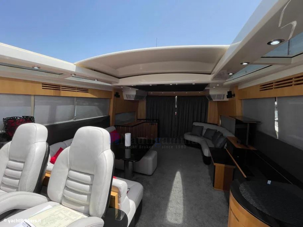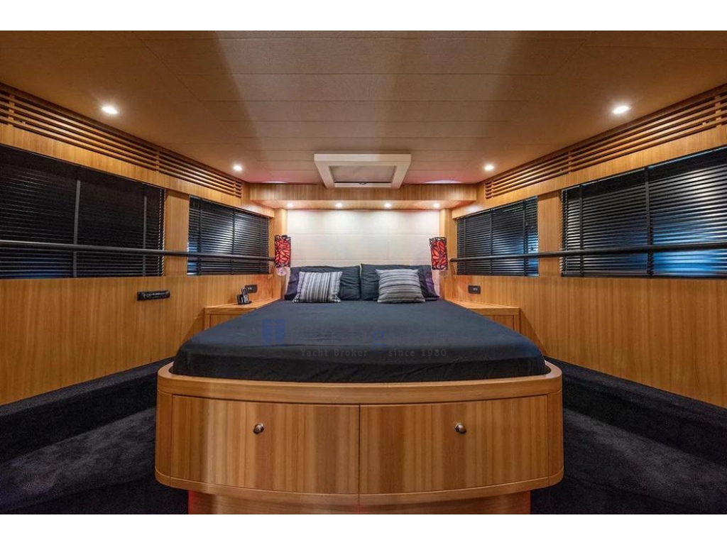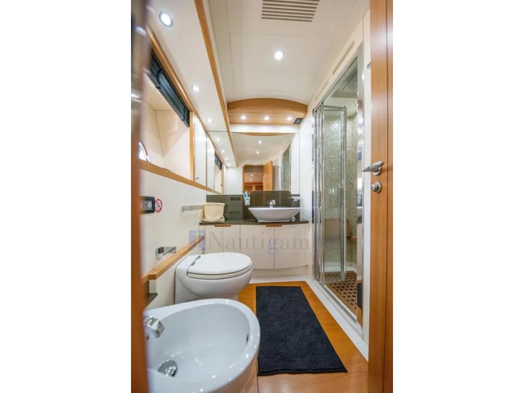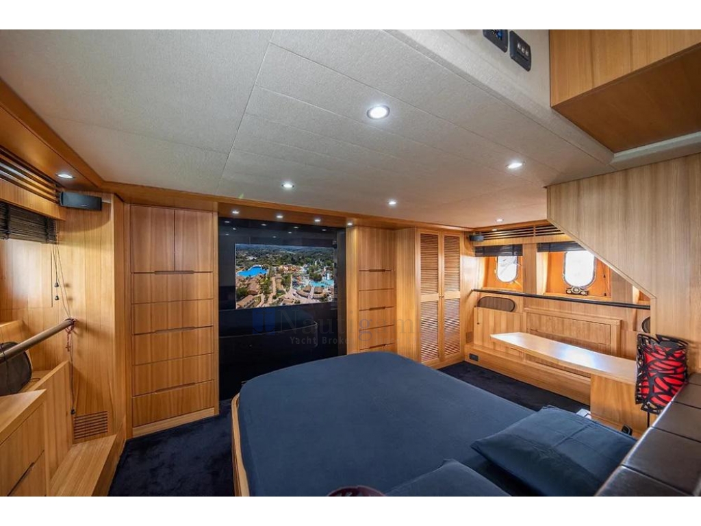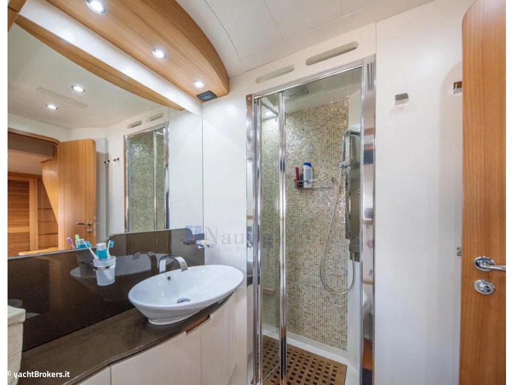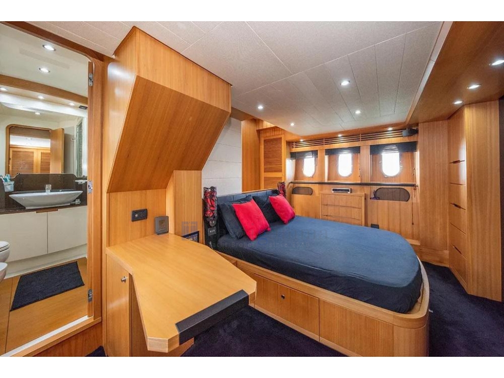 Cabina armatoriale a tutto baglio a centro barca su ponte inferiore, con letto queen size,TV 55",2 spaziosi armadi e bagno con doccia,lavandino e wc elettrico; Cabina Vip a prua con TV 24",armadio, bagno con doccia,lavandino e wc elettrico; Cabina ospiti a dritta con letti in piano e 3°letto pullman; Cabina singola a sinistra. Bagno ospiti in comune con accesso dal corridoio, doccia lavandino e wc elettrico.