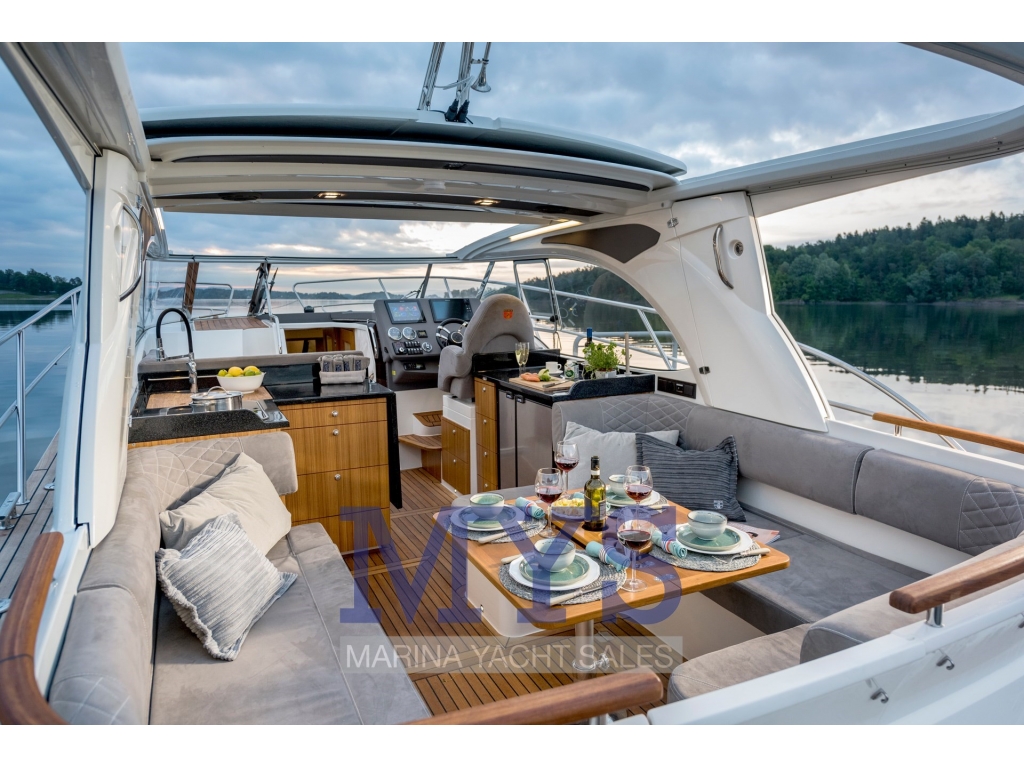 Una pratica porta integrata nel parabrezza consente un accesso rapido, sicuro e agevole al ponte di prua. Gli ampi passavanti laterali da 28 cm permettono un movimento comodo e sicuro lungo tutta l?imbarcazione. La postazione di comando, ergonomicamente studiata, insieme al cruscotto ben organizzato e alla strumentazione di facile lettura, garantisce una navigazione confortevole. L?ampia seduta tripla per pilota e co-pilota completa l?esperienza, offrendo comfort e coinvolgimento a tutta la famiglia.