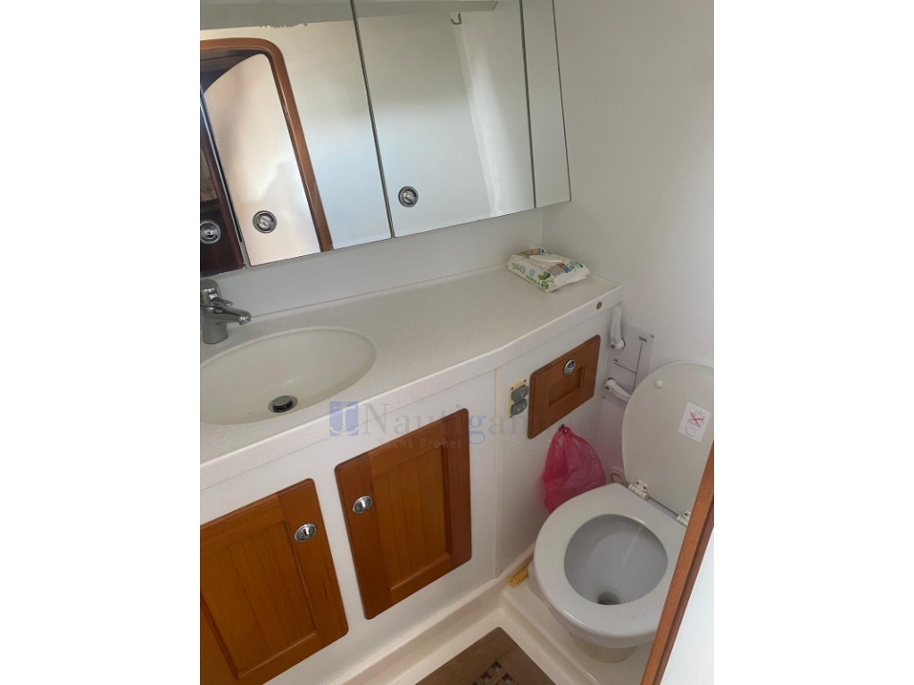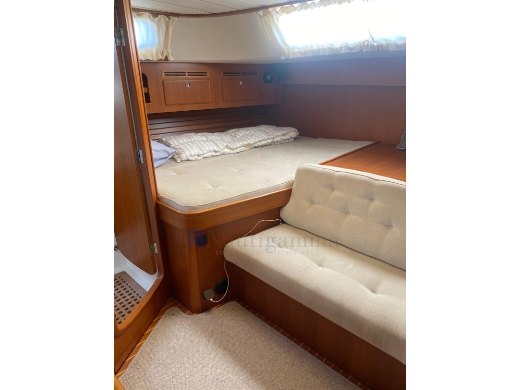 Cabina di poppa con letto matrimoniale a dritta e singolo a sinistra, Divano tra le cuccette abbassato di 5 cm e bagno con doccia separata; Cabina pruavia a dritta con letto a castello. WC a sinistra. Cabina a prua letti a V.