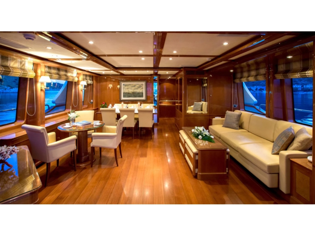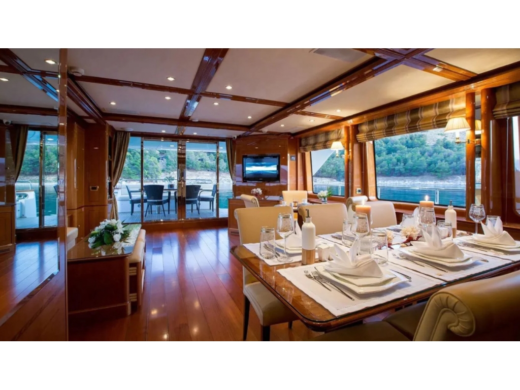 Il salone e la zona pranzo condividono un layout open space sul ponte principale, creando uno spazio luminoso e versatile per gli ospiti. Le aree esterne sono distribuite su tre ponti.