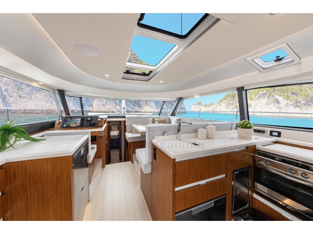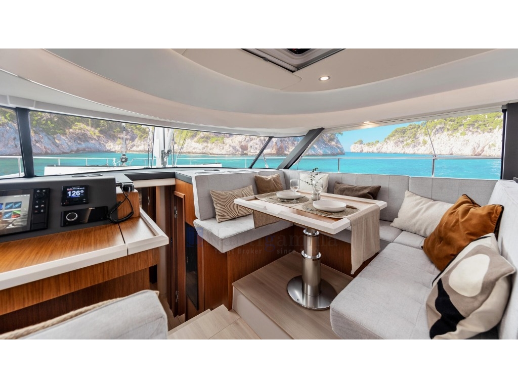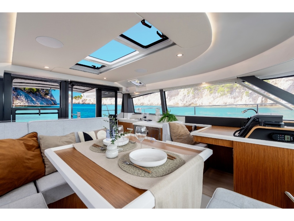 Cuscineria predisole di prua, Cuscineria pozzetto, Bimini top sopra timonerie, 2xTavoli pozzetto elettrici in teak con cuscineria dedicata, Piattaforma bagno elettrica, Scaletta bagno pieghevole, Salpancora elettrico 1500W, Ancora Delta in inox 40kg con catena inox 100mt, Telecomando con contacatena, Pulpiti di prua e poppa in acciaio, Garage per tender, Moody Smart tender System, Compressore per tender, Luci navigazione led e su camminamenti laterali, Pompa elettrica lavaggio ponte.