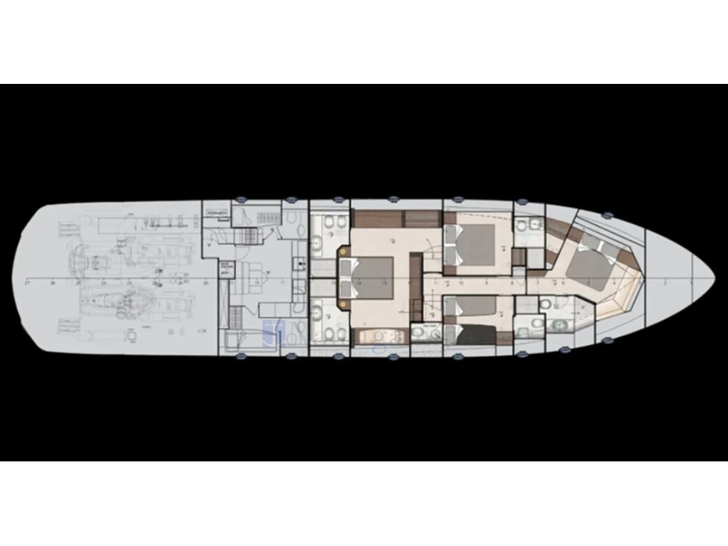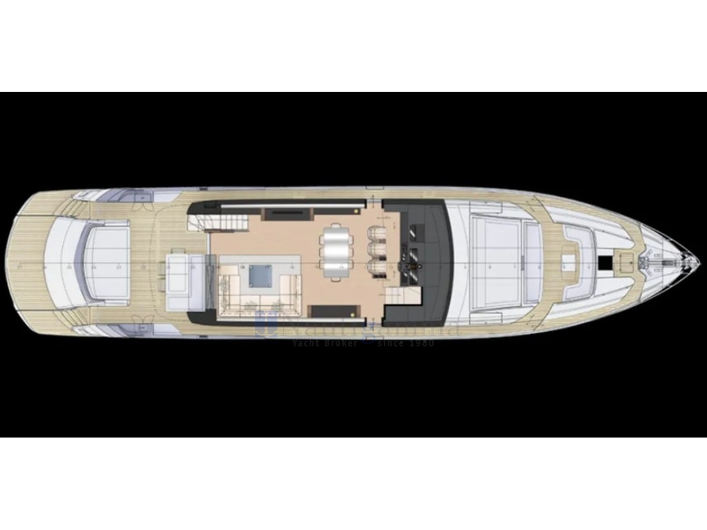 Cuscineria esterna, Tendalino sole con supporti su ponte superiore, Coperture esterne impermeabili, Tavolo pozzetto abbassabile elettricamente, Tavolino su area prendisole, Doccia esterna, Passerella idraulica, Scaletta bagno, Piattaforma idraulica, Luci subacquee, Water Toys.