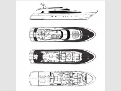 INTERNI RINNOVATI 2010. Armatoriale matrimoniale king-size con studio adiacente, 3 cabine ospiti a letti in piano, di cui 2 con 3° letto pullman, tutte con bagno en-suite (wc, bidet e box doccia). 2 Cabine equipaggio doppie con bagno (wc e box doccia).